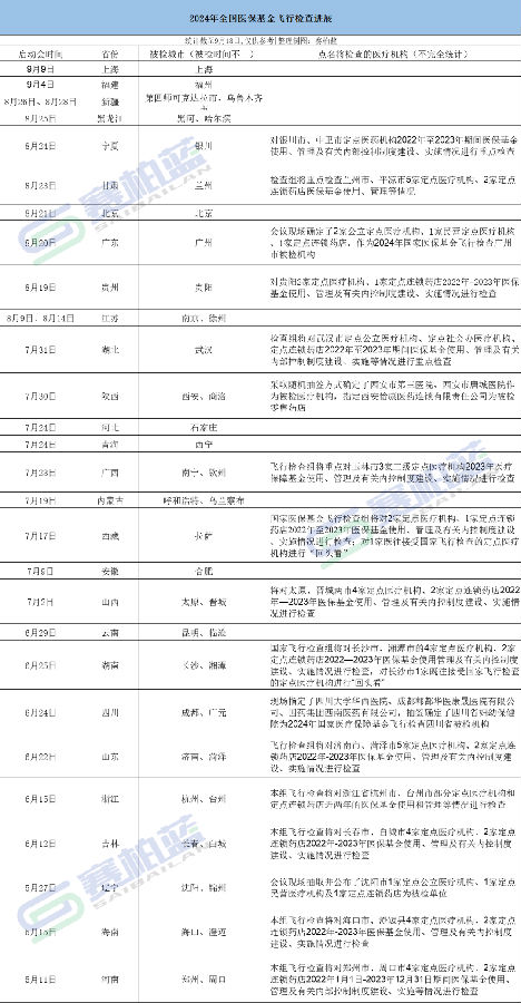 按照國(guó)家醫(yī)保局的工作安排,9月底前,全國(guó)各省份完成國(guó)家飛檢現(xiàn)場(chǎng)檢查。距離9月底還有近兩周的時(shí)間,國(guó)家醫(yī)?;痫w行現(xiàn)場(chǎng)檢查已經(jīng)覆蓋了絕大多數(shù)省、市、自治區(qū)。