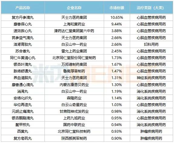 中成藥丸劑銷售額TOP20品牌中,三大王牌復(fù)方丹參滴丸、麝香保心丸、速效救心丸地位難以撼動: