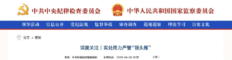 4月30日,中紀委在《深度關注丨實處用力嚴管“領頭雁”》中以廣東省廣州市紀委監(jiān)委的實踐為經驗強調對“一把手”的監(jiān)管。
