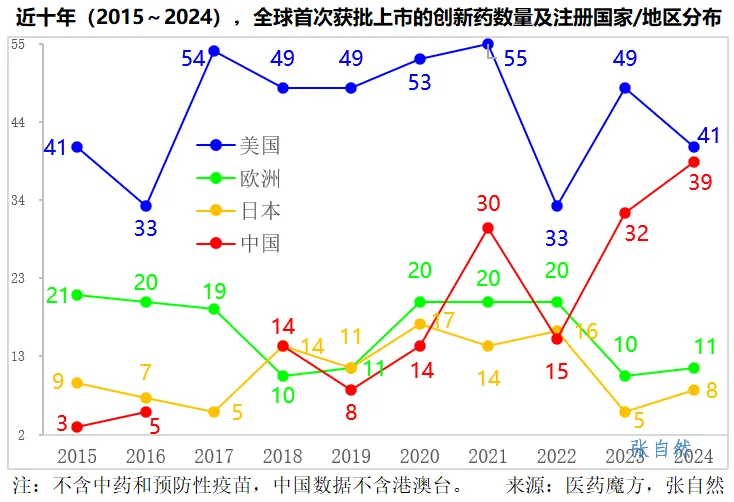 同期,美國(guó)批準(zhǔn)的創(chuàng)新藥數(shù)量與其9年前的持平,仍是41個(gè);歐洲較9年前近乎腰斬,由2015年的21個(gè)下降到了2024年的11個(gè),由全球第2位下滑到第3位;2024年,日本批準(zhǔn)了8個(gè)創(chuàng)新藥,較9年前2015年的還少了1個(gè),全球排名由第3位下降到第4位。(詳見下圖)