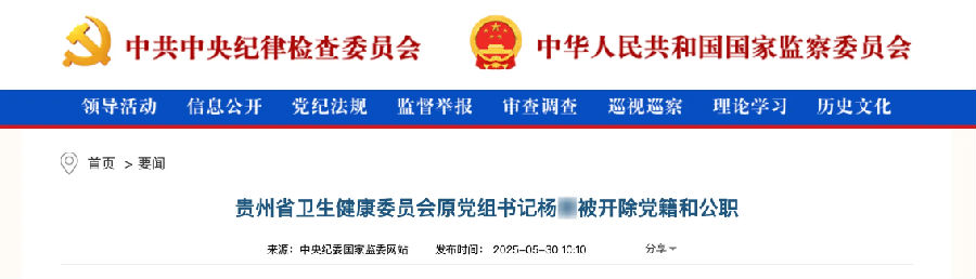 5月30日,貴州省紀委監(jiān)委發(fā)布消息,貴州省衛(wèi)健委原黨組書記楊某被開除黨籍和公職。通報指出,楊某在干部調(diào)動工作中為他人謀取利益并收受財物,違規(guī)收受禮金,不正確履行工作職責(zé),違規(guī)插手市場經(jīng)濟活動,將公權(quán)力當作攫取私利的工具,大搞權(quán)錢交易,利用職務(wù)便利為他人謀取利益,并非法收受巨額財物等。