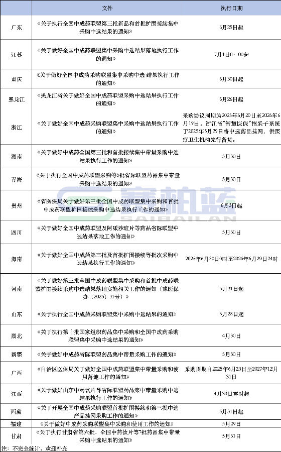 全國中成藥聯盟集采中選結果,多省陸續(xù)執(zhí)行。 01 大批中成藥 集采中選結果將落地 據賽柏藍梳理,目前至少已經有19省/市/自治區(qū)發(fā)布全國中成藥聯盟第三批集采中選結果落地安排。 第三批全國中成藥集采已于2025年4月起在各省陸續(xù)落地執(zhí)行。湖北是最早執(zhí)行的省份之一,于4月30日開始執(zhí)行。其他省份的執(zhí)行時間有所不同,大多集中在5月末和6月執(zhí)行,具體如下。 全國中成藥聯盟集采共涉及20個產品組、95個產品,共有174個藥品中選。而后,又有8個產品復活擬中選,134個非報價代表品擬中選。 在不少省份發(fā)布的通知中,明確了采購周期以及首個采購周期,并對采購價格何時切換作出了時間安排。 如廣東省在《關于執(zhí)行全國中成藥聯盟第三批新品和首批擴圍接續(xù)集中采購中選結果的通知》中稱,此次集中采購周期為2025年6月25日至2027年12月31日,首年采購周期為2025年6月25日至2026年6月24日。 廣東全國中成藥采購聯盟第三批集采共有313個藥品中選,涉及近160家生產企業(yè);廣東全國中成藥采購聯盟首批擴圍接續(xù)集采共有492個藥品中選,涉及超170家生產企業(yè)。其要求,各市要在集采結果落地執(zhí)行第3個月組織對本市醫(yī)療機構中選藥品進院情況開展一輪問題排查等。 江蘇省發(fā)布《關于做好全國中成藥聯盟集中采購中選結果落地執(zhí)行工作的通知》指出,此次集采自2025年7月1日00:00起全省統(tǒng)一執(zhí)行。同時,6月25日-6月30日,將進行網簽采購合同;6月26日起,江蘇省平臺切換采購價格,中選企業(yè)本次集采目錄內非中選清單產品同步暫停采購。 02 中成藥集采 提質擴面 第三批中成藥集采通過規(guī)則優(yōu)化、強力監(jiān)管及差異化執(zhí)行,實現了降價與保量平衡。不完全梳理發(fā)現,今年來,全國多地已經進行了多個批次的中成藥單省/省際聯盟集采。 如安徽省2024年度中成藥集采結果已經公布,11個藥品中選;廣東聯盟金蓮花膠囊等中成藥集中帶量采購,323個藥品中選,其中175個藥中選,148個藥限量中選。 廣東聯盟金蓮花膠囊等中成藥集中帶量采購的品種是廣東聯盟清開靈等中成藥集中帶量采購采購清單涉及的藥品劑型,與全國中成藥聯盟集中帶量采購第三批和首批擴圍接續(xù)采購品種范圍重疊的藥品劑型不列入其中,廣東聯盟清開靈等中成藥集中帶量采購共有53個品種中選。 自2020年6月金華市藥品耗材帶量集中采購聯盟委員會關于開展金華市第二批藥品帶量采購公告發(fā)布后,各地中成藥集采相繼展開,并在分組、競價和中選規(guī)則上持續(xù)完善。 國家醫(yī)保局計劃2025將在地方層面開展具備專業(yè)特色的全國聯盟采購預計達到20個左右,包括中成藥、中藥飲片以及高值耗材等,預計2025年國家和聯盟組織開展的藥品集采品種將達到700個。 集采提質擴面下,中成藥集采仍有擴容空間。