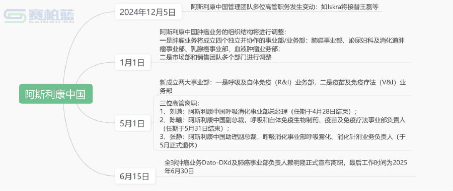 據(jù)賽柏藍不完全統(tǒng)計發(fā)現(xiàn),僅半年時間左右,阿斯利康中國至少已經(jīng)進行了3次架構(gòu)調(diào)整,最近的一次是5月1日,阿斯利康中國新設(shè)呼吸及自體免疫(R&I)業(yè)務部和疫苗及免疫療法(V&I)業(yè)務部。同時,部分高管變動。具體如下: