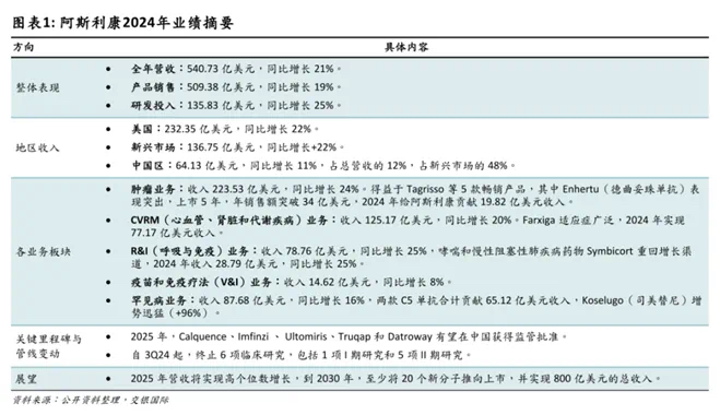 作為阿斯利康第一大業(yè)務板塊,腫瘤業(yè)務營收占2024年產(chǎn)品總收入的41%,為223.53億美元(+24%)。這主要得益于多款抗腫瘤藥物的穩(wěn)定增長,如Tagrisso(奧希替尼)、Imfinzi(度伐利尤單抗)、Calquence(阿可替尼)、Lynparza(奧拉帕利)、Enhertu(德曲妥珠單抗),同比增速均超過10%。