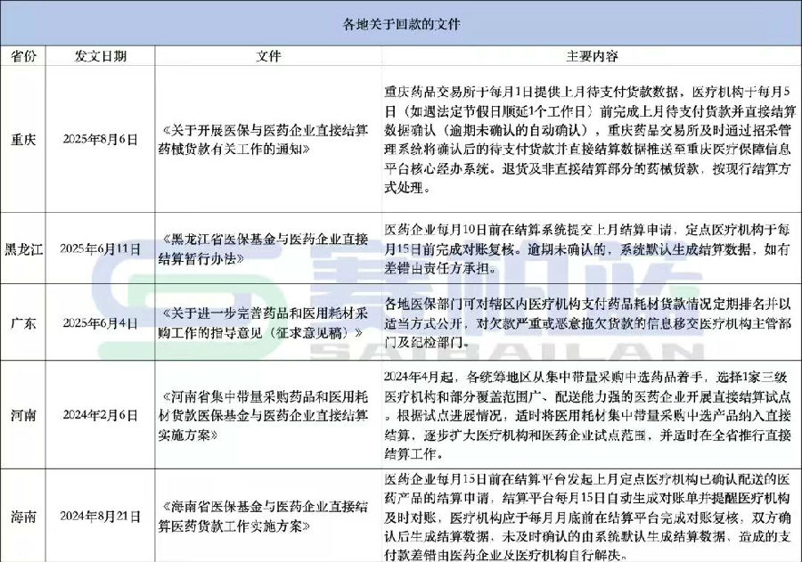 集采藥品耗材、國談藥回款難問題,全部破解時間將至。 01 醫(yī)保直接結(jié)算推進(jìn)提速 集采內(nèi)回款效率迎來突破 根據(jù)國家醫(yī)保局要求,2025年全國基本實現(xiàn)集采藥品耗材、國談藥的直接結(jié)算,2026年全國全面實現(xiàn)集采藥品耗材、國談藥的直接結(jié)算。 當(dāng)前已進(jìn)入8月末,距離 “全國全面實現(xiàn)集采藥品耗材、國談藥直接結(jié)算” 的最終目標(biāo)時限已進(jìn)入關(guān)鍵沖刺階段,各項配套工作推進(jìn)節(jié)奏明顯加快。 近日,2025年全國醫(yī)療保障工作年中座談會在陜西召開,會議要求,逐步擴(kuò)大醫(yī)?;饘︶t(yī)藥機(jī)構(gòu)即時結(jié)算范圍。 從階段性成效來看,截至6月底,全國超90%的統(tǒng)籌地區(qū)實現(xiàn)即時結(jié)算,撥付時限壓縮至申報后20個工作日內(nèi)。與此同時,醫(yī)保基金對醫(yī)藥集采企業(yè)直接結(jié)算推進(jìn)同樣成效顯著,平均結(jié)算周期壓縮至30天以內(nèi)。 據(jù)賽柏藍(lán)觀察,截至目前,全國已有多個省份及統(tǒng)籌地區(qū)率先響應(yīng)國家要求,發(fā)布了針對醫(yī)保與醫(yī)藥企業(yè)直接結(jié)算的地方性實施細(xì)則或推進(jìn)方案。 8月27日,重慶市醫(yī)保局發(fā)布《關(guān)于開展醫(yī)保與醫(yī)藥企業(yè)直接結(jié)算藥械貨款有關(guān)工作的通知》的政策解讀,重慶藥品交易所每月1日提供上月待支付貨款數(shù)據(jù),醫(yī)療機(jī)構(gòu)于每月5日前完成上月待支付貨款并直接結(jié)算數(shù)據(jù)確認(rèn)。這一政策自9月15日起執(zhí)行。 8月26日,天津市醫(yī)藥采購中心發(fā)布《關(guān)于藥品、醫(yī)用耗材集采中選品種2025年第8期直接結(jié)算》的通知,要求醫(yī)保定點醫(yī)藥機(jī)構(gòu)在8月27日-8月30日24:00完成本期待結(jié)算明細(xì)表網(wǎng)上確認(rèn);8月31日—9月3日12:00,經(jīng)營企業(yè)完成本期待結(jié)算明細(xì)表網(wǎng)上確認(rèn)。 從地方反饋的實效來看,不少省份已明確體現(xiàn)出回款速度加快的積極變化。 例如,自5月以來,浙江省藥械采購平臺設(shè)置集采品種和國談藥品結(jié)算專區(qū),至6月30日,1182家醫(yī)保定點機(jī)構(gòu)完成結(jié)算金額近58億元,按時結(jié)算率99.90%,其中1136家實現(xiàn)100%按時結(jié)算;江蘇鹽城市第一人民醫(yī)院自今年1月以來,開展醫(yī)?;鸺磿r結(jié)算改革試點,醫(yī)?;鸾Y(jié)算縮短到一個工作日,日均現(xiàn)金流增加200萬元,到目前已累計撥付1.5億元。 不過,行業(yè)反饋呈現(xiàn)明顯差異化特征,集采內(nèi)藥品回款改善顯著,但集采之外的普通藥品仍陷“回款難、回款慢” 困境。 黑龍江一醫(yī)藥商業(yè)企業(yè)人士向賽柏藍(lán)表示,相較于一年前,其手上集采藥品的回款已基本追回,“主要是政策壓力傳導(dǎo)到位,且集采藥品本身貨款規(guī)模相對可控,因此回款速度明顯加快”,但該人士同時指出,集采范圍之外的普通藥品,回款難、回款慢的壓力依然較大,成為當(dāng)前結(jié)算改革尚未完全覆蓋的領(lǐng)域。 02 集采外藥品回款難仍是長期痛點 多因素疊加影響回款周期 事實上,藥品回款難一直是行業(yè)長期存在的核心痛點。從醫(yī)院的資金壓力、醫(yī)保結(jié)算的滯后性到流通環(huán)節(jié)的層層墊付以及企業(yè)自身的管理問題多重因素疊加下,回款周期不斷拉長。 集采之外藥品的回款不適用集采的 “統(tǒng)一回款周期”,而是由參與方通過合同約定,醫(yī)院或商業(yè)公司未按合同約定時間付款,藥品入庫數(shù)量、破損理賠、發(fā)票問題導(dǎo)致付款金額與約定不符以及藥品配送延遲、質(zhì)量問題與回款掛鉤等問題均會影響回款進(jìn)度。