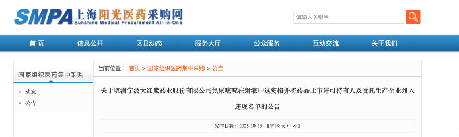 聯(lián)合采購辦公室決定取消寧波大紅鷹藥業(yè)股份有限公司氟尿嘧啶注射液中選資格,同時將寧波大紅鷹藥業(yè)股份有限公司和黑龍江福和制藥集團股份有限公司列入“違規(guī)名單”,暫停兩家企業(yè)自2025年10月15日至2027年4月14日參與國家組織藥品集中采購活動的申報資格。